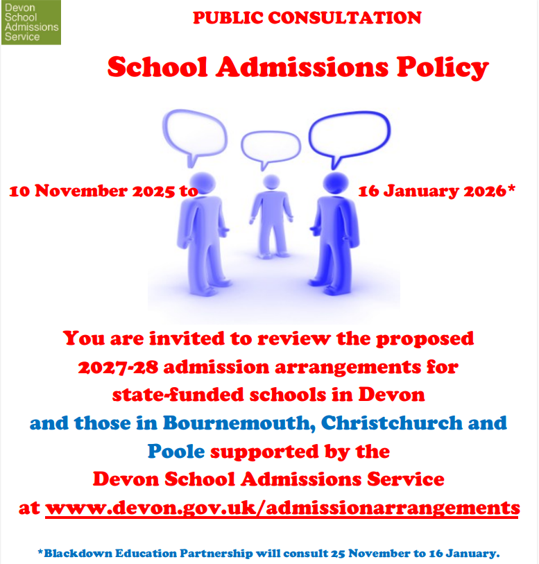 For questions about your child joining the school or just about the admissions process in general, please don’t hesitate to contact the school direct or contact Devon School Admissions Service on 0345 155 1019 or by email to admissions@devon.gov.uk.